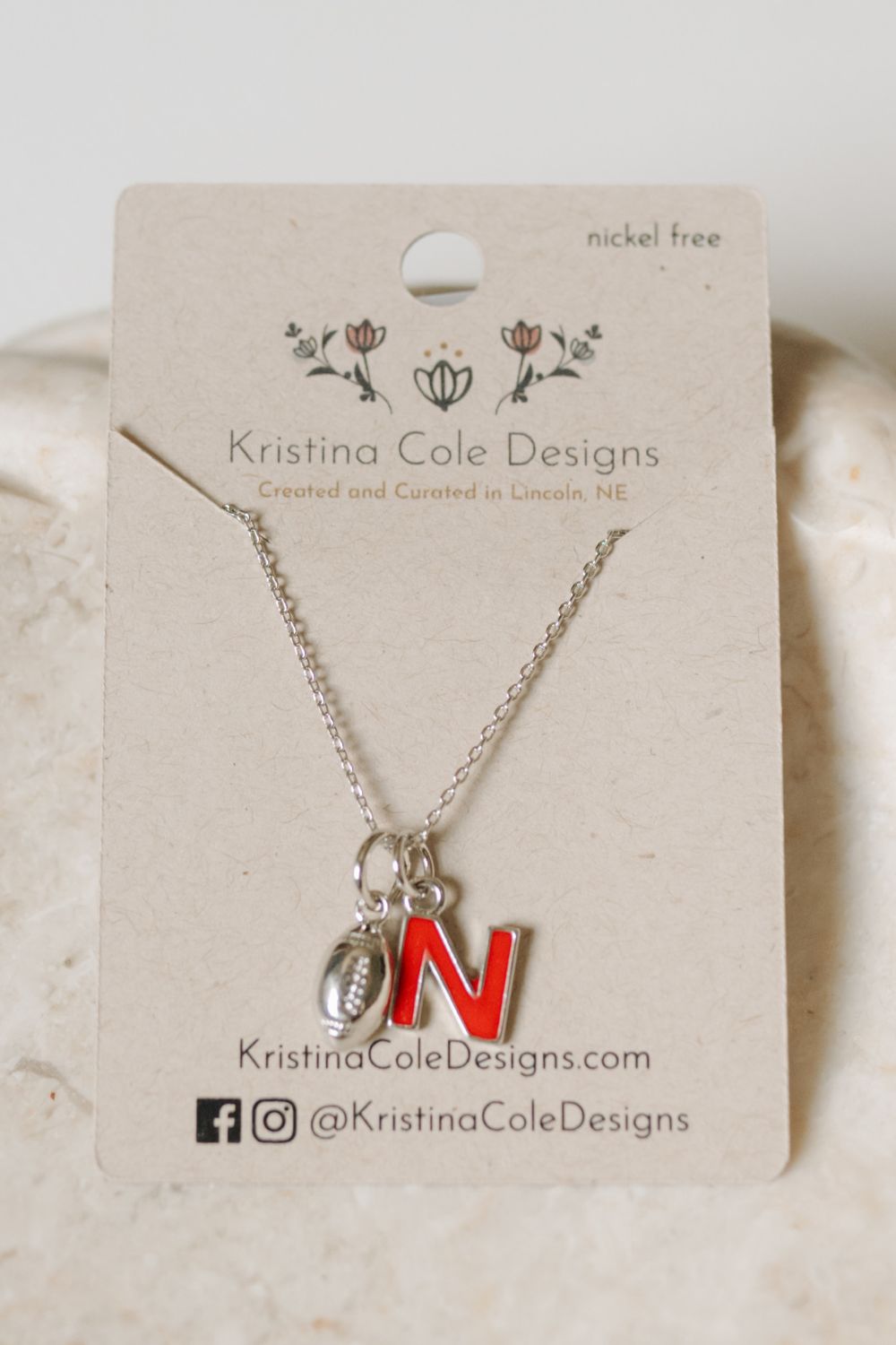 Silver polish and football charm make this initial necklace a winning pick for any Huskers fan.